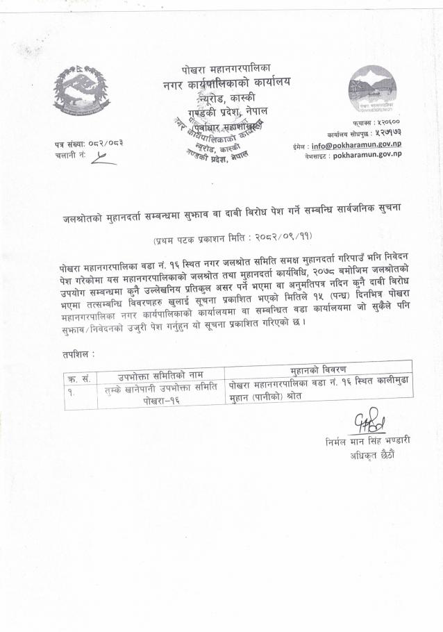 जलश्रोतको मुहान दर्ता सम्बन्धमा सुझाव वा दाबी विरोध पेस गर्ने सम्बन्धी सार्वजनिक सूचना (पोखरा १६)