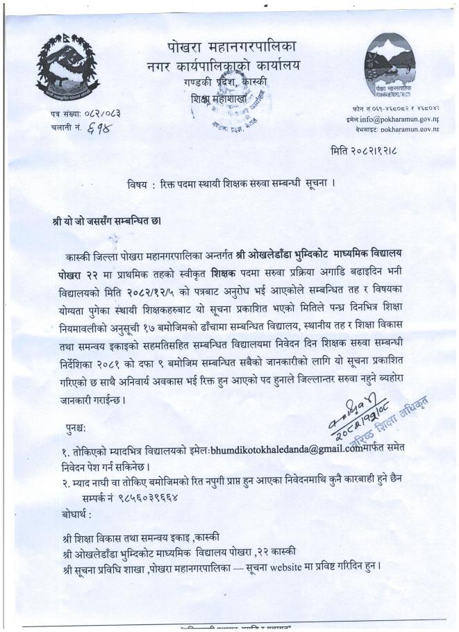 रिक्त पदमा स्थायी शिक्षक सरुवा सम्बन्धी सूचना (श्री ओखलेडाडा मा.वि पोखरा-२२)