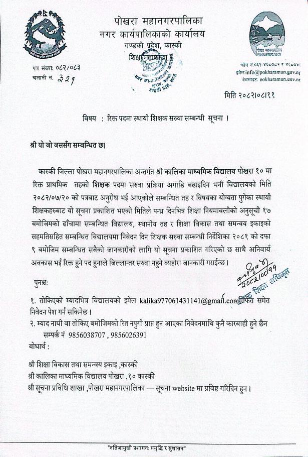 रिक्त पदमा स्थायी शिक्षक सरुवा सम्बन्धी सूचना (श्री कालिका मा.वि., पोखरा १०)