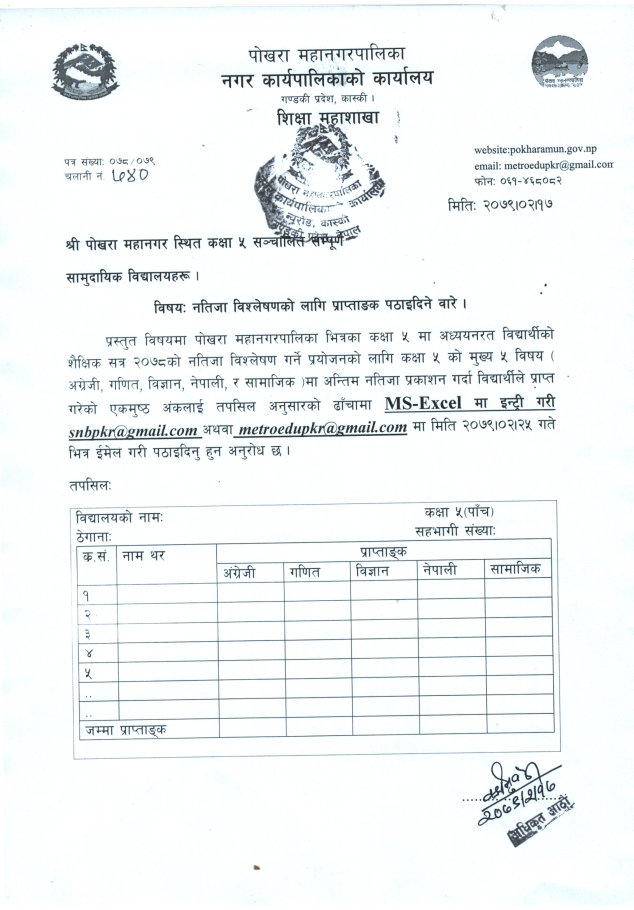 कक्षा ५ को नतिजा विश्लेषण को लागि नतिजा उपलब्ध गराईदिने वारे