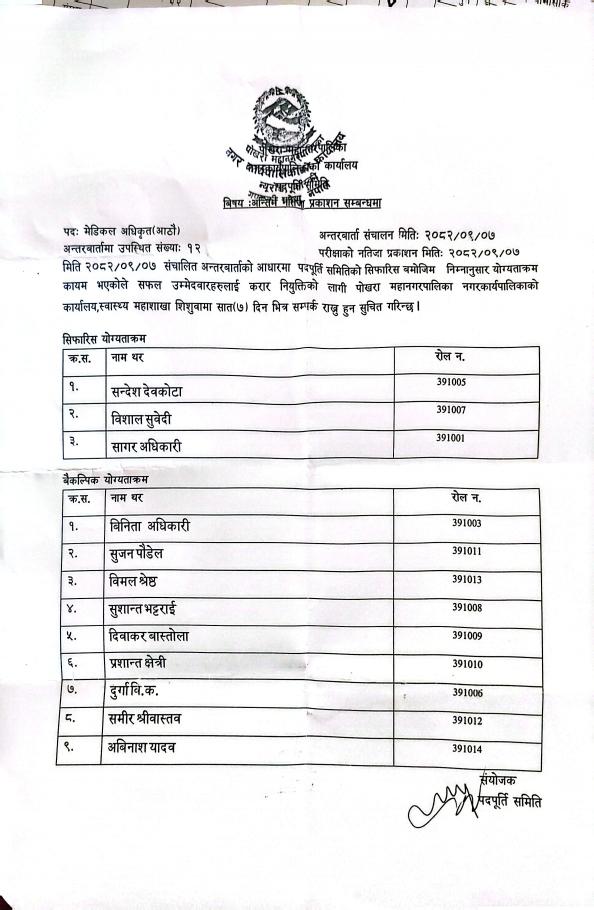 नतिजा प्रकाशन सम्बन्धमा (सेवा करारमा कर्मचारी पदपूर्ति गर्ने सम्बन्धी सूचना (प्रथम पटक प्रकाशित मिति: २०८२/०८/१२))