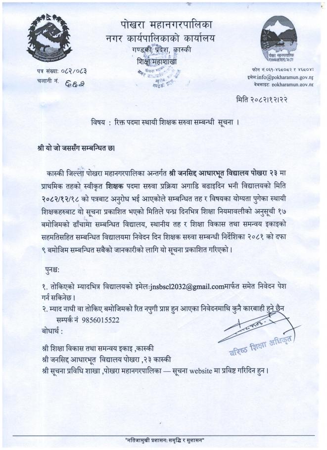 रिक्त पदमा स्थायी शिक्षक सरुवा सम्बन्धी सूचना (श्री जनसिद्ध आ.वि पोखरा-२३)
