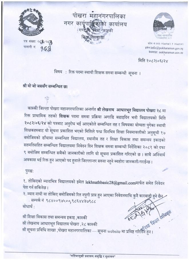 रिक्त पदमा स्थायी शिक्षक सरुवा सम्बन्धी सूचना (श्री लेखनाथ आधारभूत विद्यालय पोखरा २८)