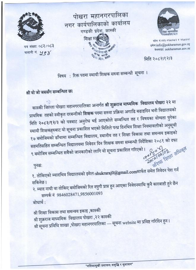 रिक्त पदमा स्थायी शिक्षक सरुवा सम्बन्धी सूचना (श्री शुक्रराज मा.वि पोखरा-२२)