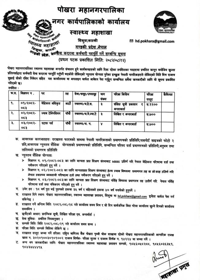 सेवा करारमा कर्मचारी पदपूर्ति गर्ने सम्बन्धी सूचना (प्रथम पटक प्रकाशित मिति: २०८२/०८/१२)