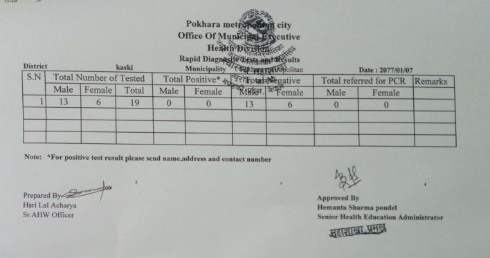 २०७७/०१/०७ को Rapid Diagnostic Test and Result विवरण