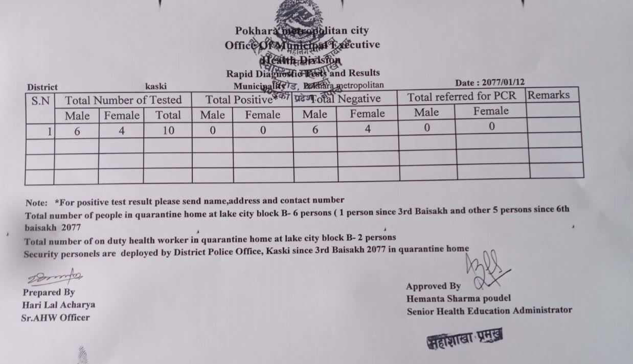 २०७७/०१/ १२ को Rapid Diagnostic Test and Result विवरण