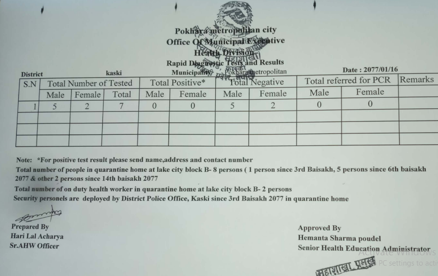 २०७७/०१/ १६ को Rapid Diagnostic Test and Result विवरण
